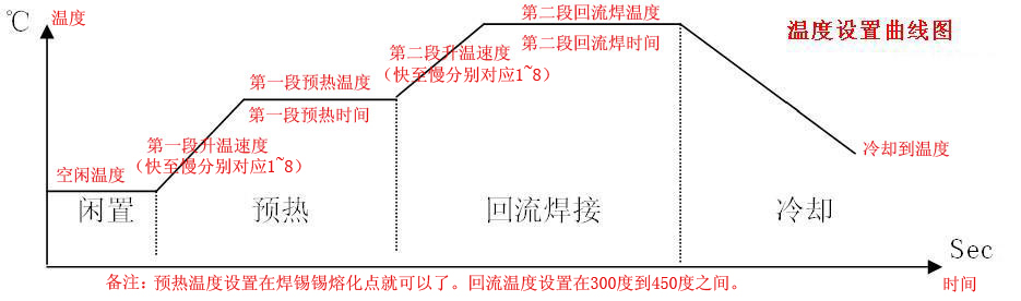 二,溫度與時間的設(shè)定:溫度設(shè)定分叁段: 預(yù)熱,焊接,和降溫。
